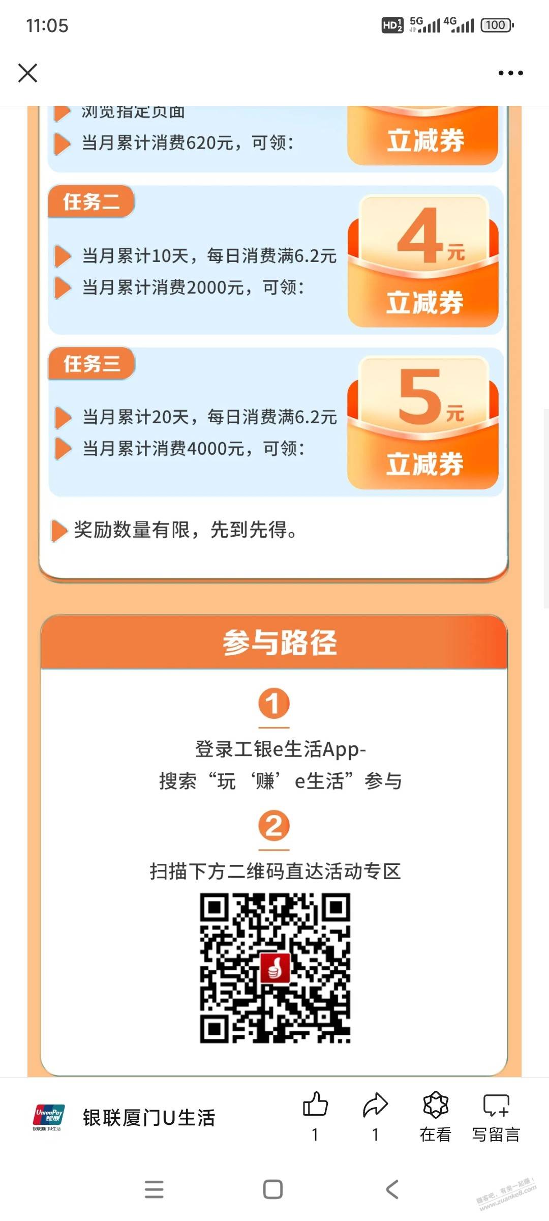 [分享转发]工行APP底部“我的”->绿色能量->累计能量綐换1~10亓vx..