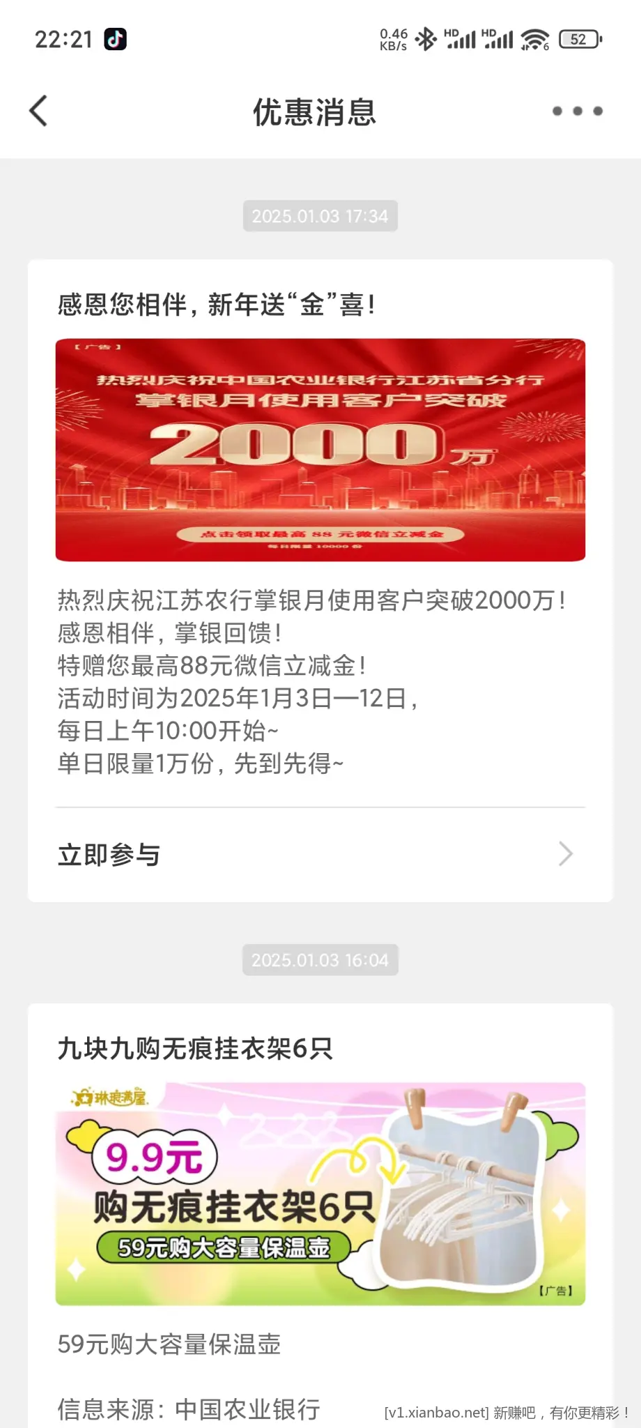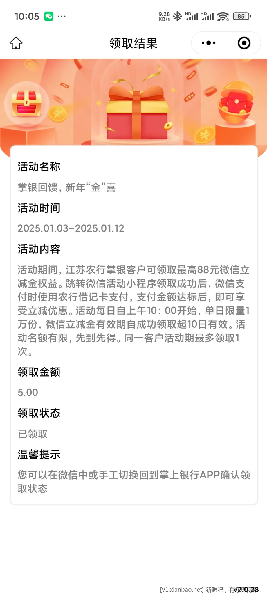 江苏银行2元微信立减金
