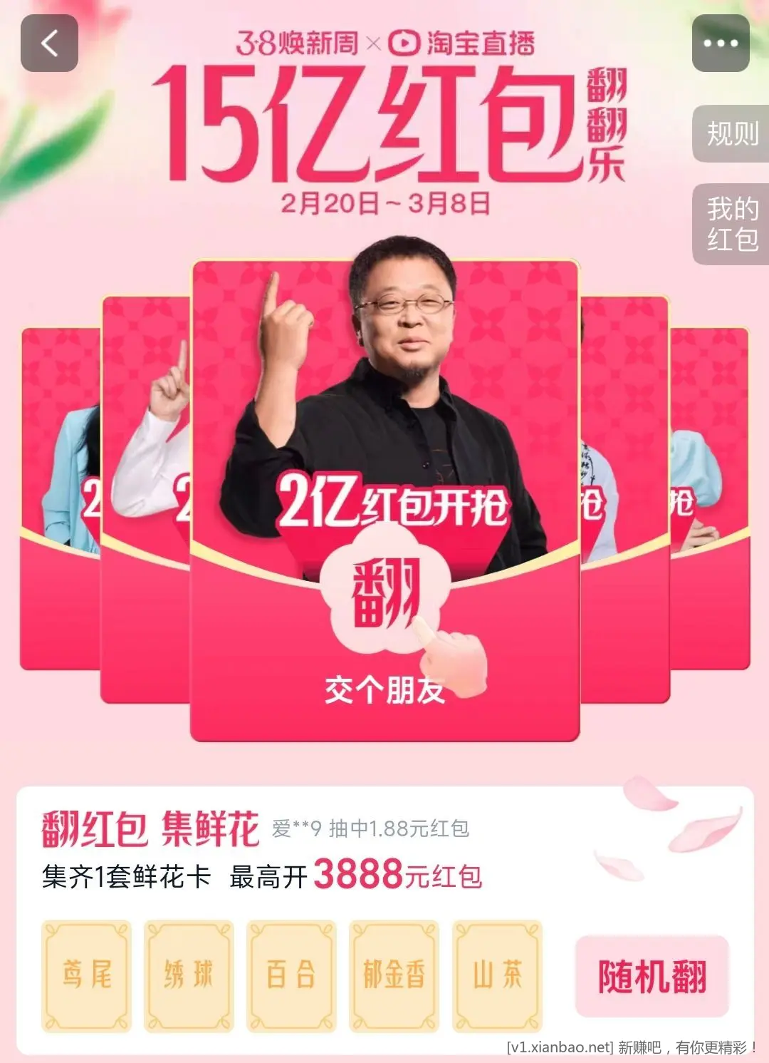 手淘搜红包翻翻乐集卡可得直播间
