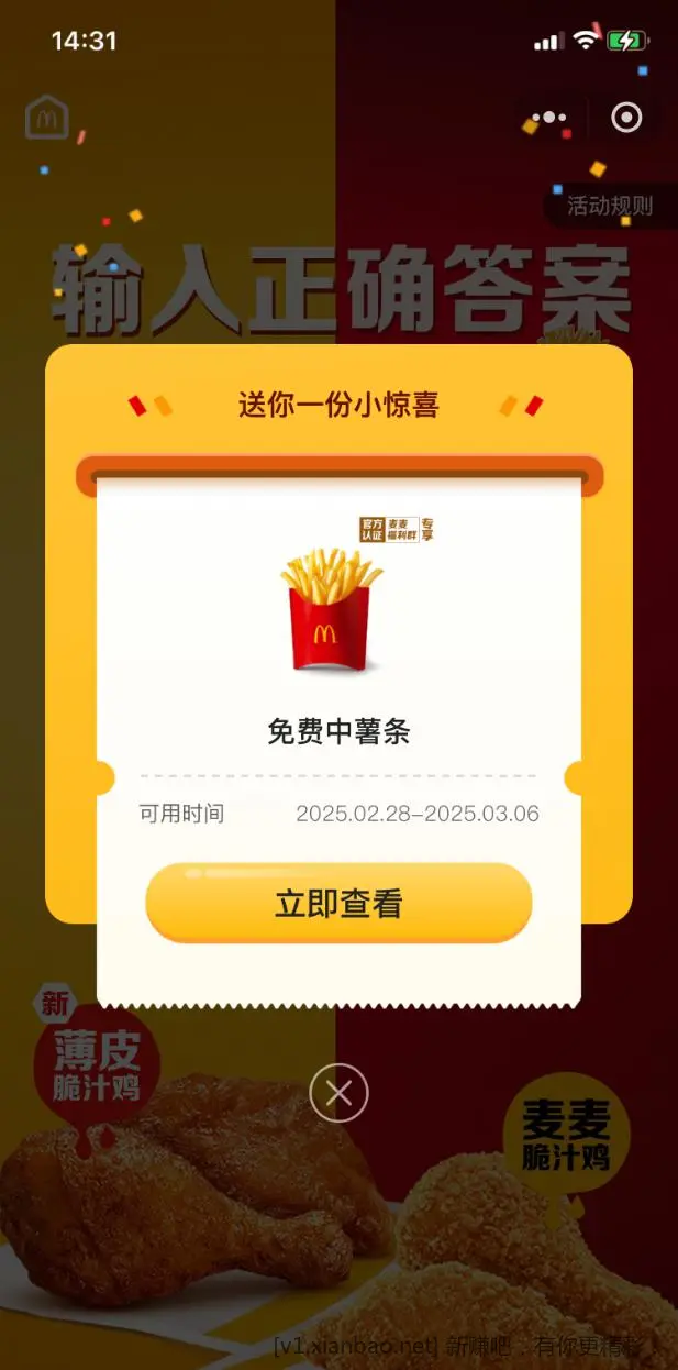 免费麦当劳中薯条,满10元随单