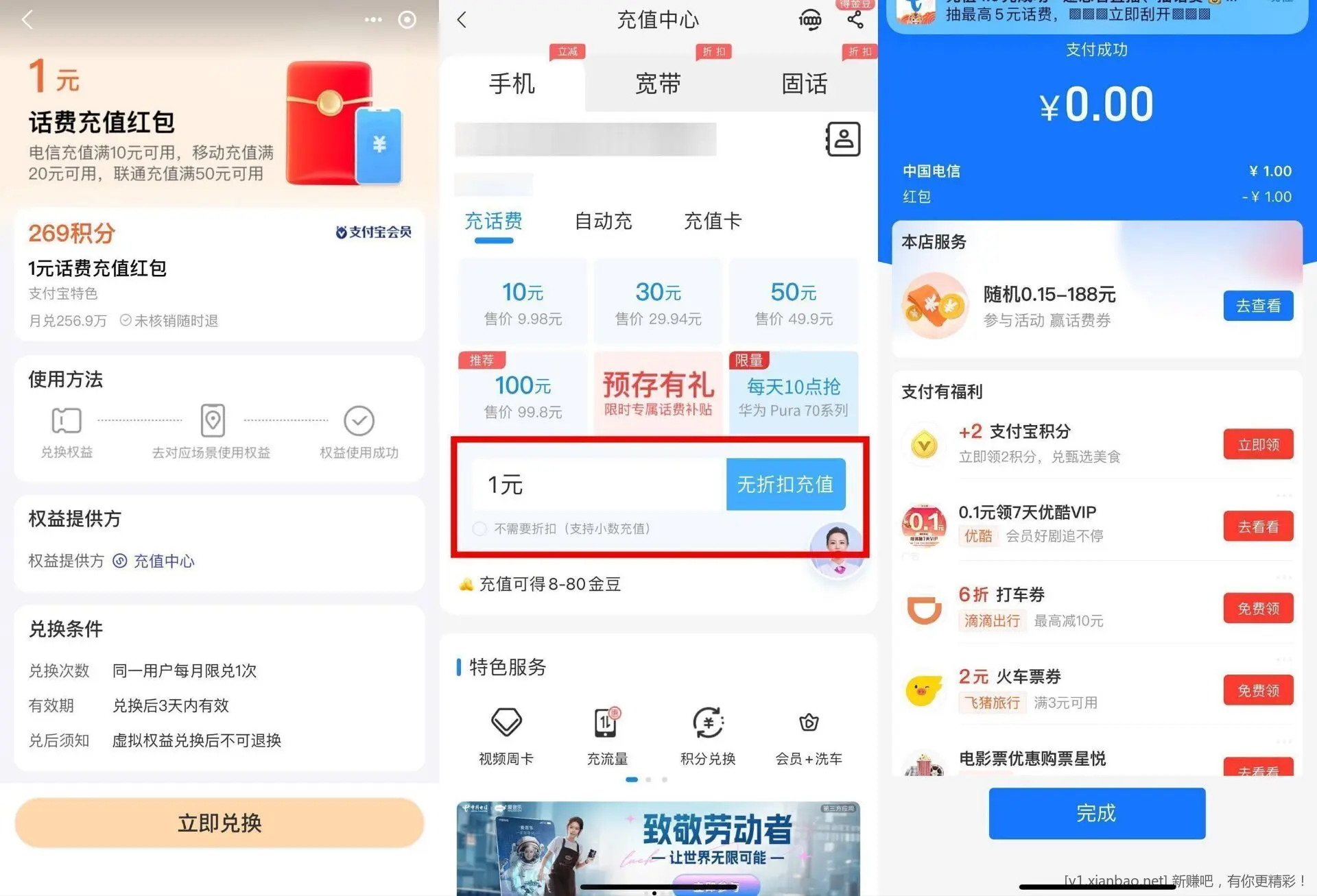 联通电信3个0.5充1元话费