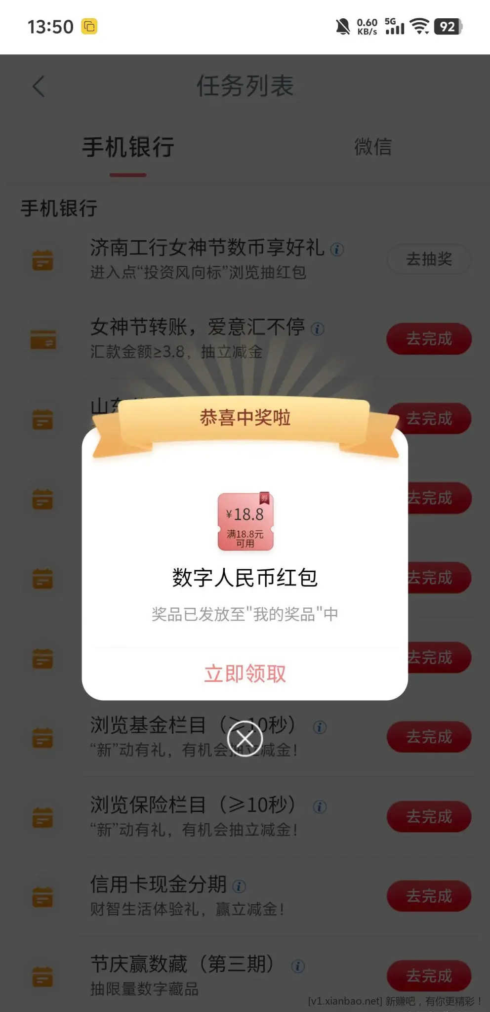 ⑤:打开工商银行注册登录,搜索任务中心,有一个任务《济南工行女神节》,直接抽必18.88数字人民币红包。