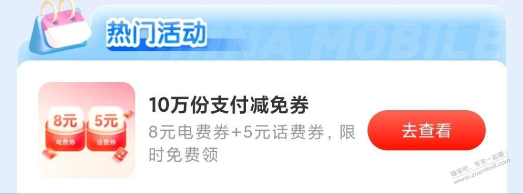 移动1元支付宝红包或8元电费券5元话费券