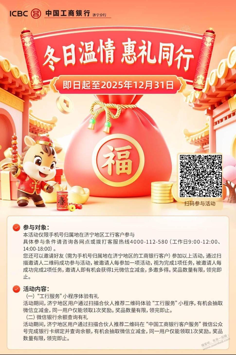 【山东济宁】vx工行扫码,保底3元,直接领2元,使用完之后再得1元