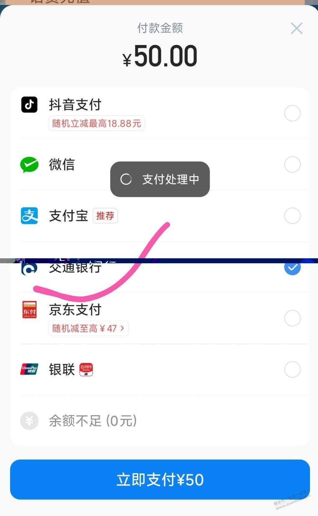 哈罗app手机充值50-5,选银联跳转交行支付