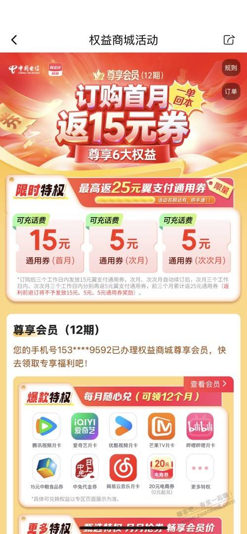 翼支付尊享会员首月可以免费领个腾讯或者其他视频会员