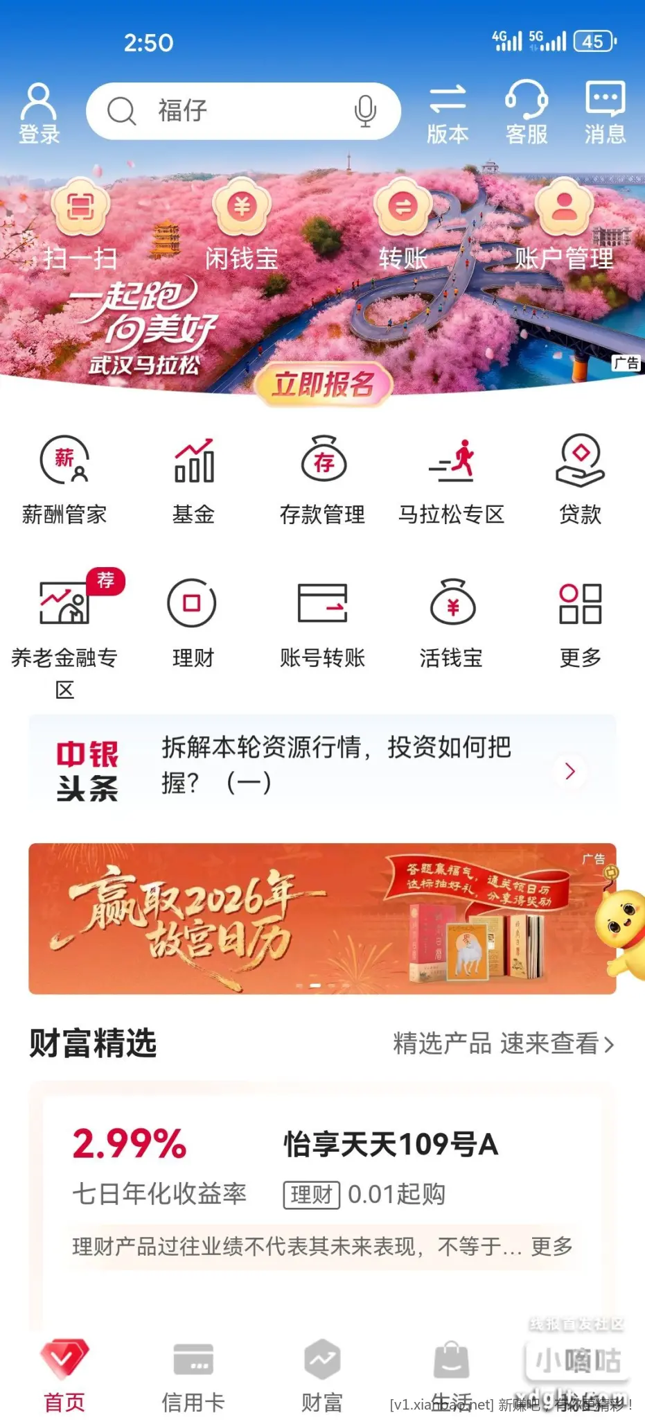 中行app中间横幅赢取2026故宫日历30题全中有机会领取,数量有限。某鱼都已经炒疯了,非必中。