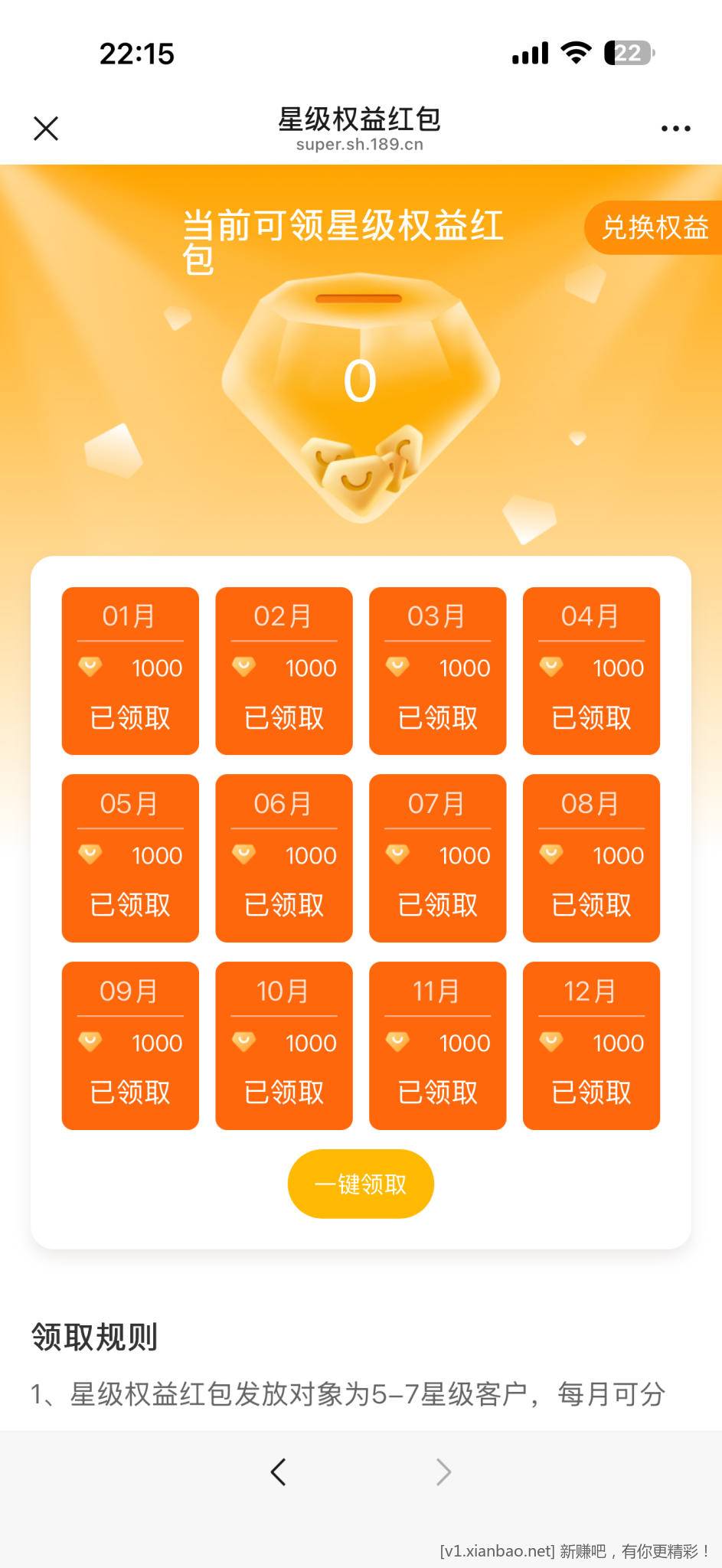 中国电信上海客服公众号,专区与帮助,星级服务进去,中间滚动页面领权益进去,我5星,领了12000积分,年底一键领取正好,可以换好多东西