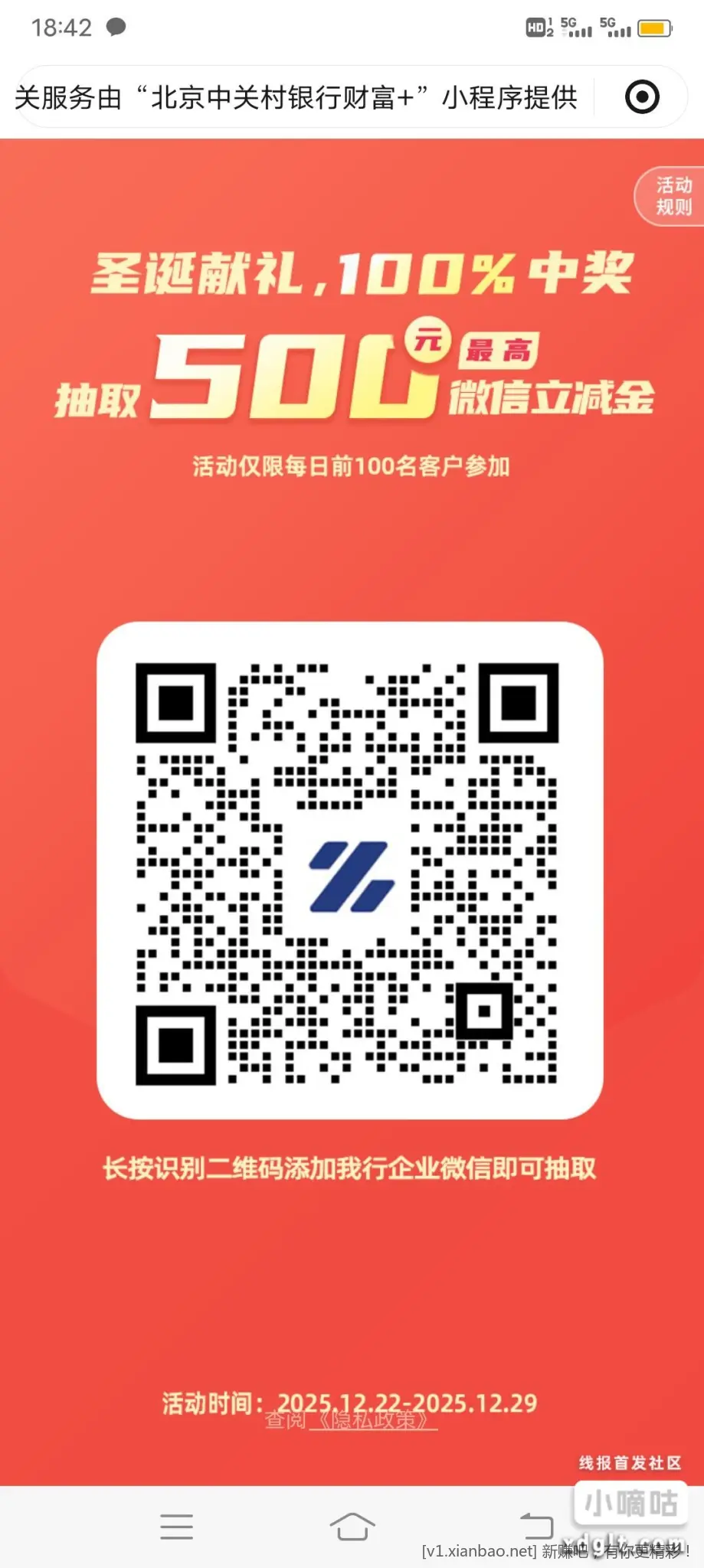 中关村银行,开过电子账户的,加过企业微信的,删除了,过了12点,每个微有2元立减金,多微多做,不能让夜猫子吃独食。