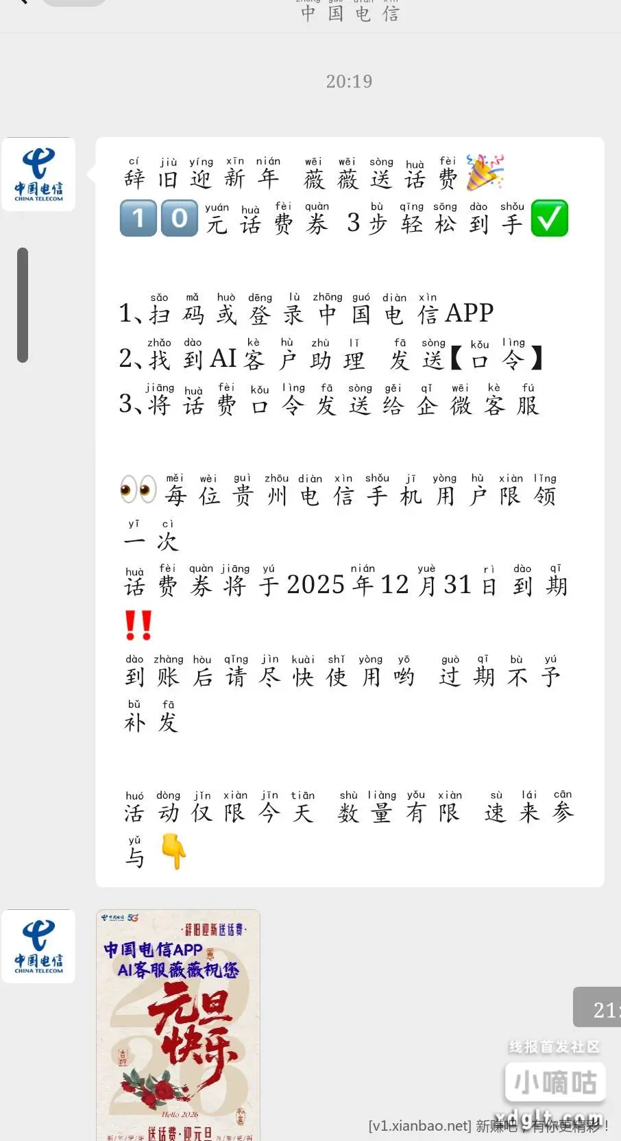 仅限新疆电信20元话费换30元现金