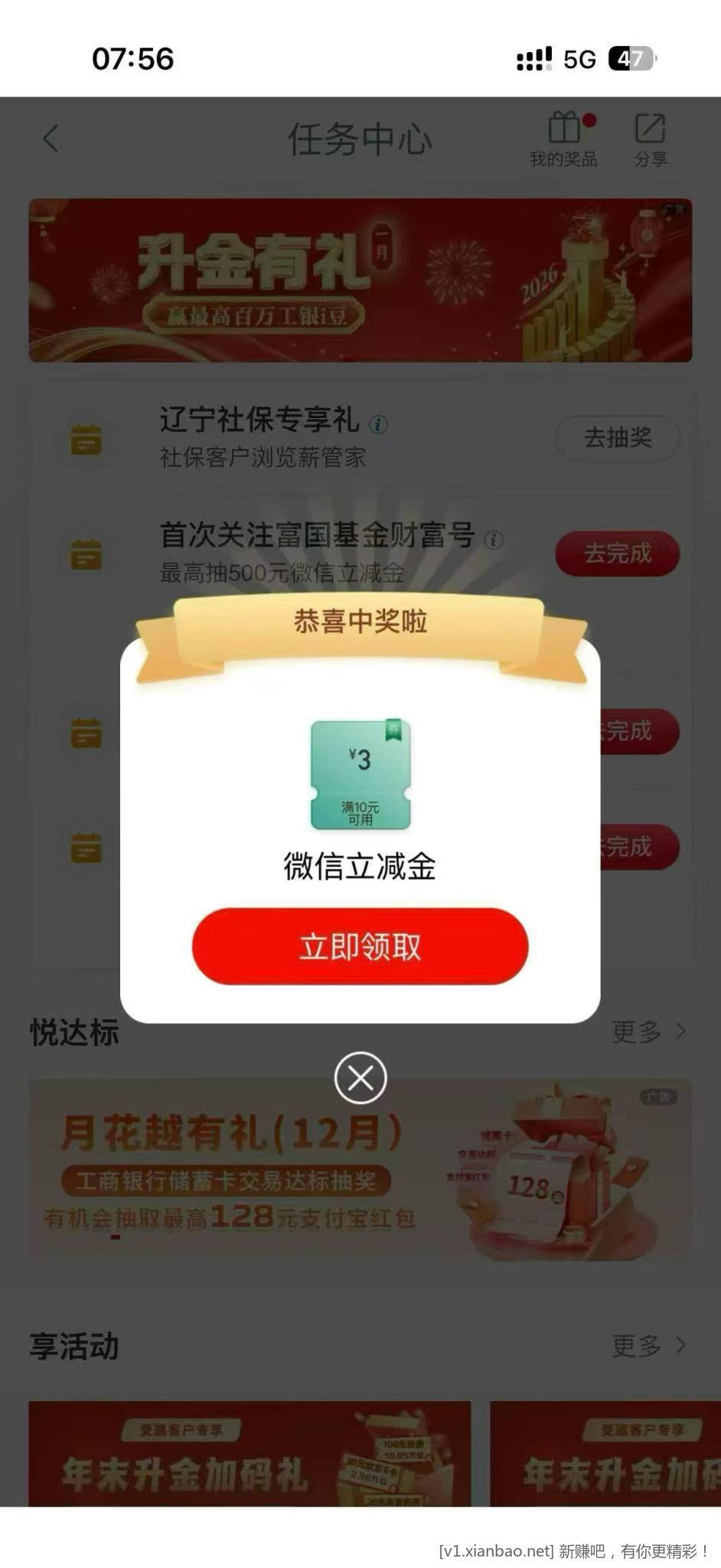 第二步:返回手机银行→任务中心→辽宁社保专享礼→领3元立减金(只限辽宁工行社保卡客户,速抢)