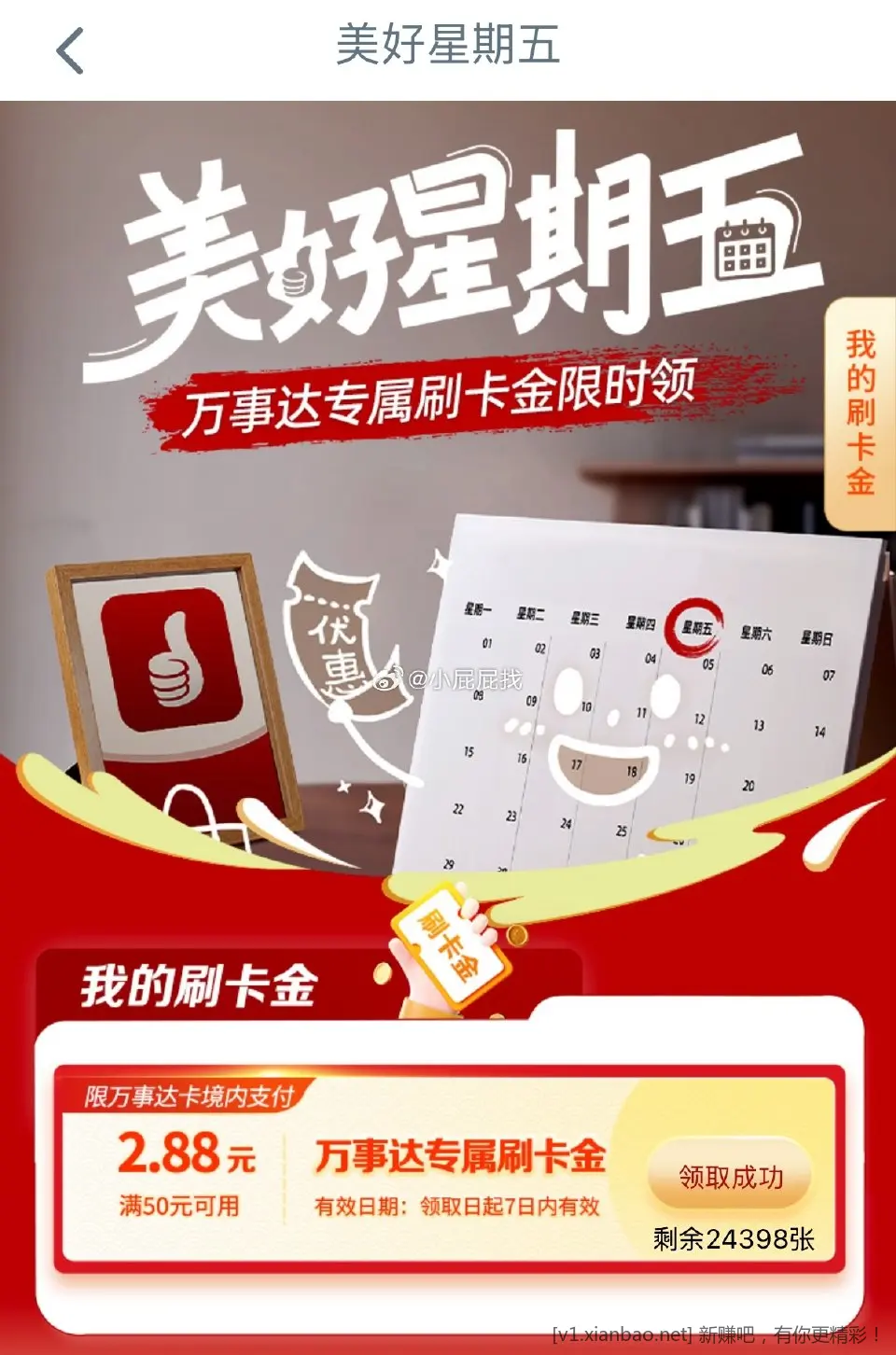 工银e生活APP搜索“美好星期五”领取满50元可用2.88元刷卡金限工银信用卡万事达专属