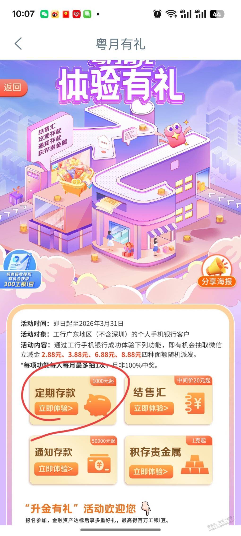 搜 粤月有礼,体验定期存款,存定期1000整存整取一年,可中微信立减金。建议次日取回,