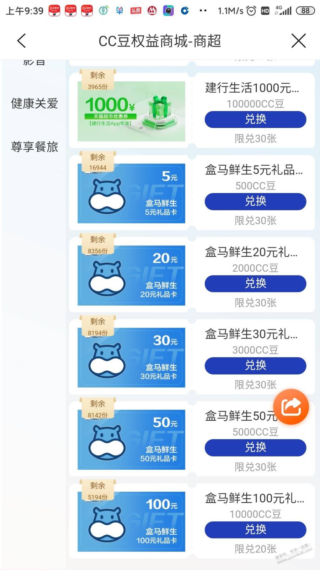 建行cc豆有盒马礼品卡,快过期的可以试试
