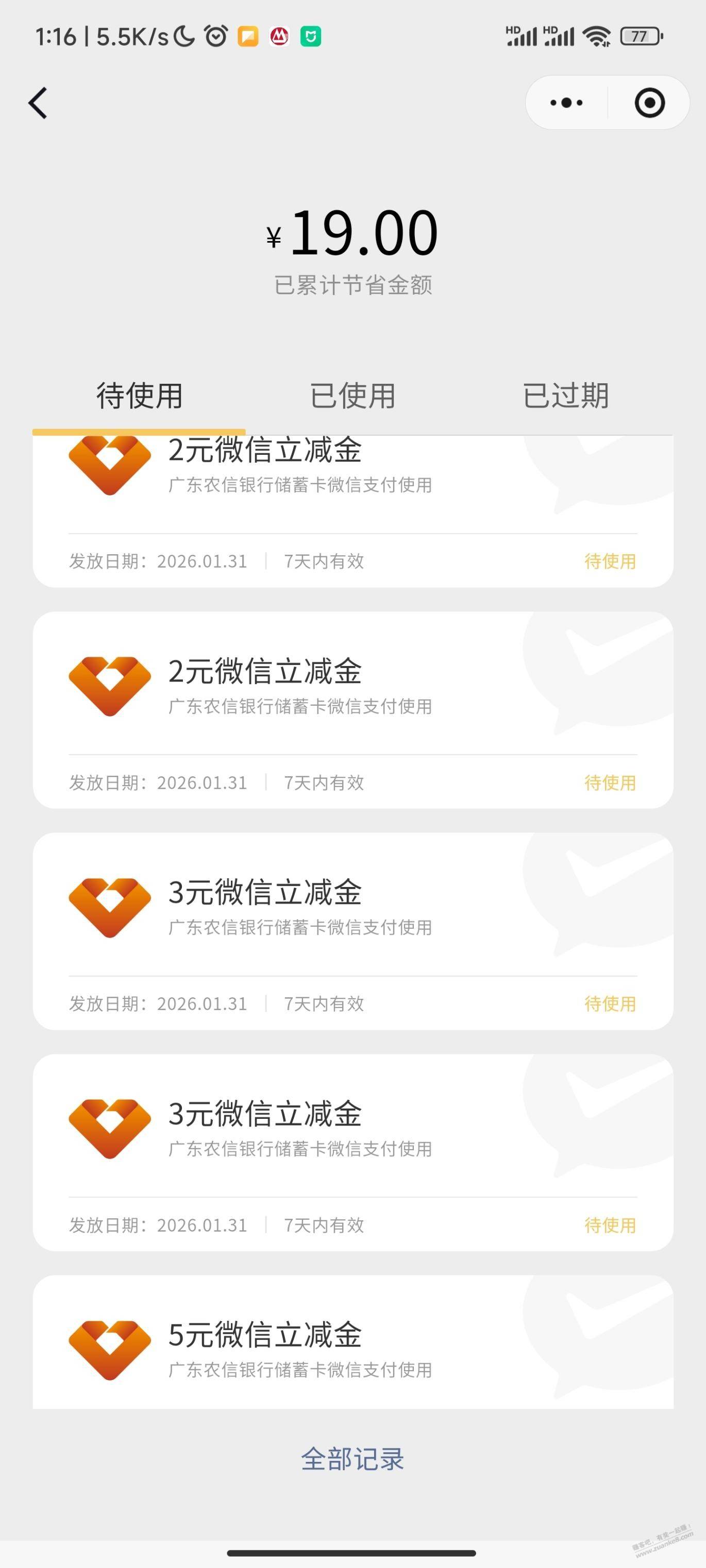 微信转账有福利小程序,选择农信,每次转1000,5000实测19元立减金。