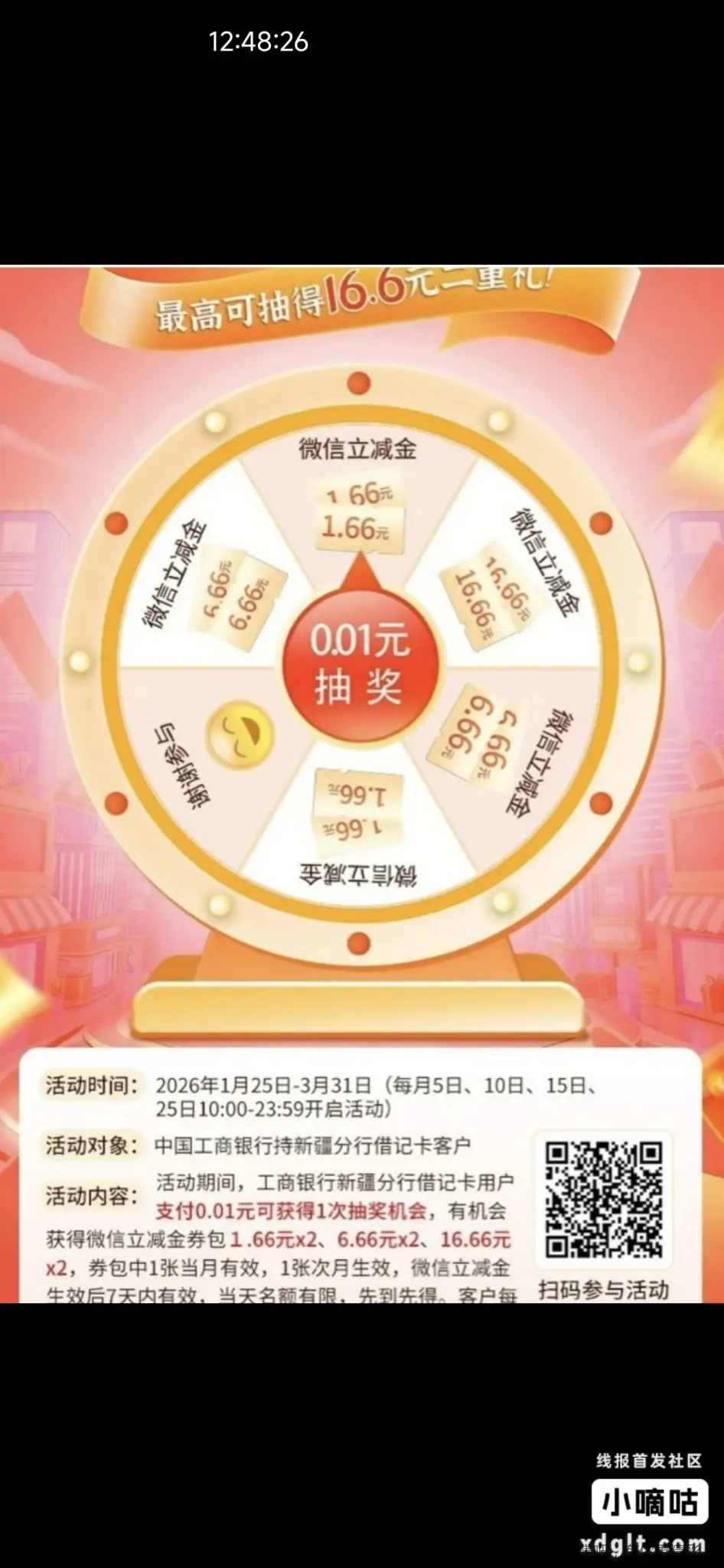 新疆工行卡付1分抽立减金,微扫活动不用地区,保底1.66x2立减金也限卡