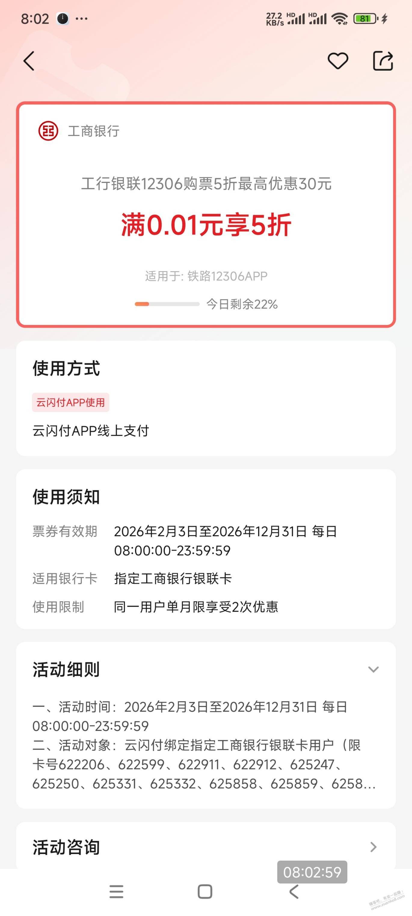 工行火车票五折(-30)还有名额