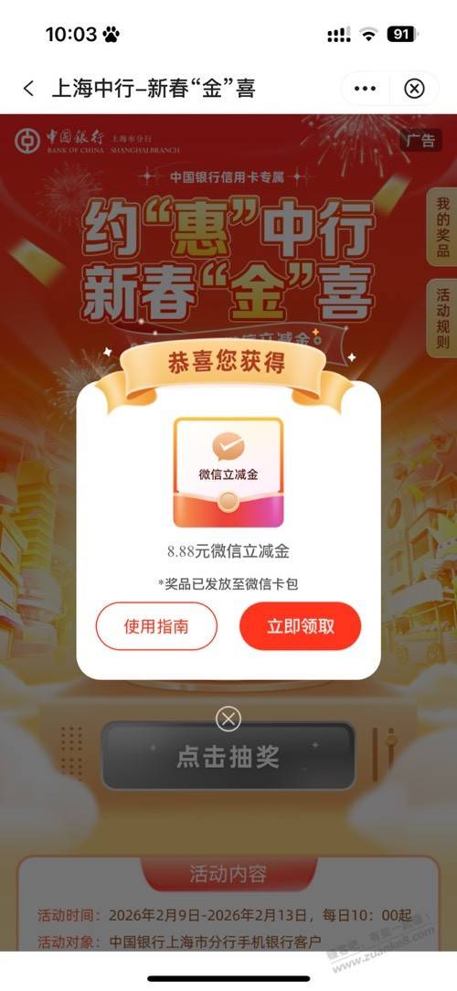 上海中行抽9.9元立减金