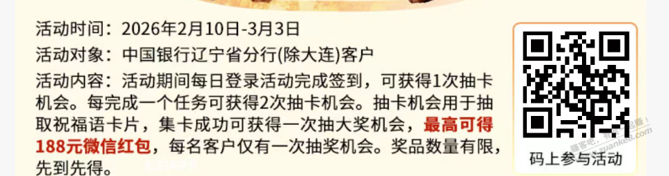 活动对象:中国银行辽宁省分行(除大连)客户活动内容:活动期间每日登录活动完成签到,可获得1次抽卡机会。每完成一个任务可获得2次抽卡机会。抽卡机会用于抽取祝福语卡片,集卡成功可获得一次抽大奖机会,最高可得188元微信红包,每名客户仅有一次抽奖机会。奖品数量有限,先到先得。