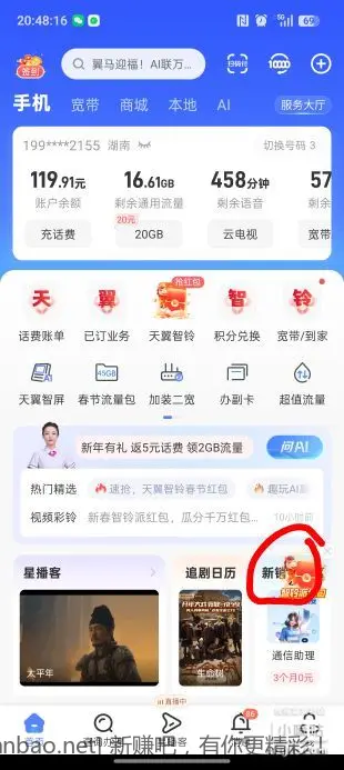 中国电信抽话费红包单次满2元及以上可领取复制链接