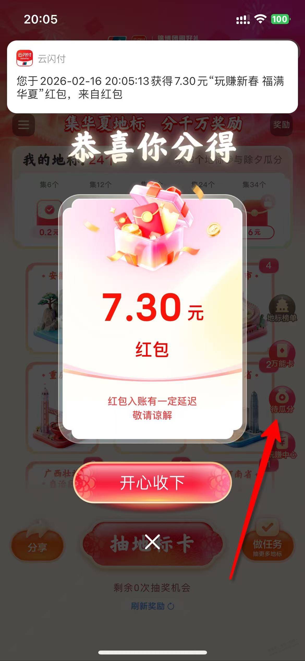 云闪付地标除夕红包已开7.3