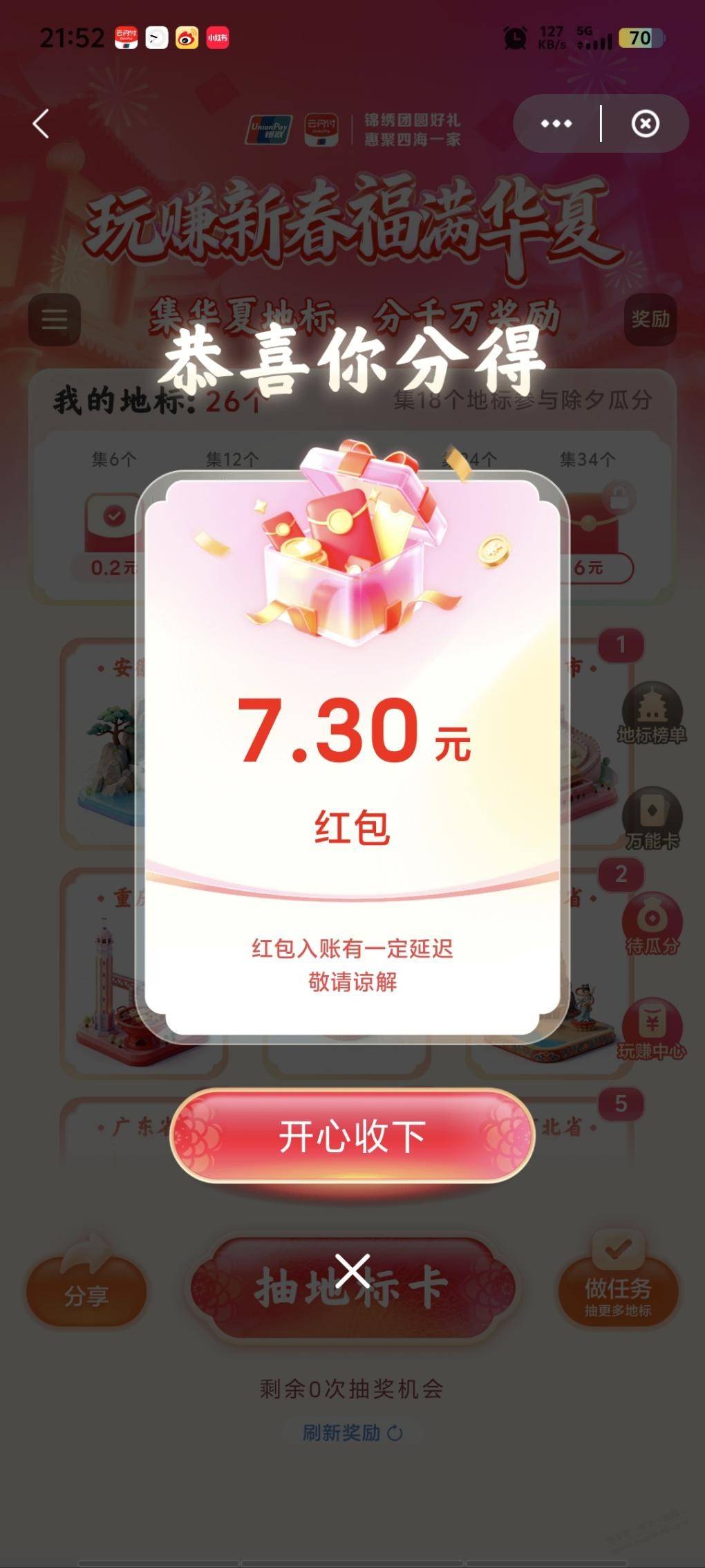 云闪付地标除夕红包已开7.3