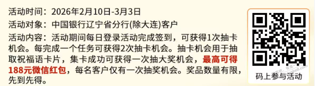 活动内容:活动期间每日登录活动完成签到,可获得1次抽卡机会。每完成一个任务可获得2次抽卡机会。抽卡机会用于抽取祝福语卡片,集卡成功可获得一次抽大奖机会,最高可得188元微信红包,每名客户仅有一次抽奖机会。奖品数量有限,先到先得。