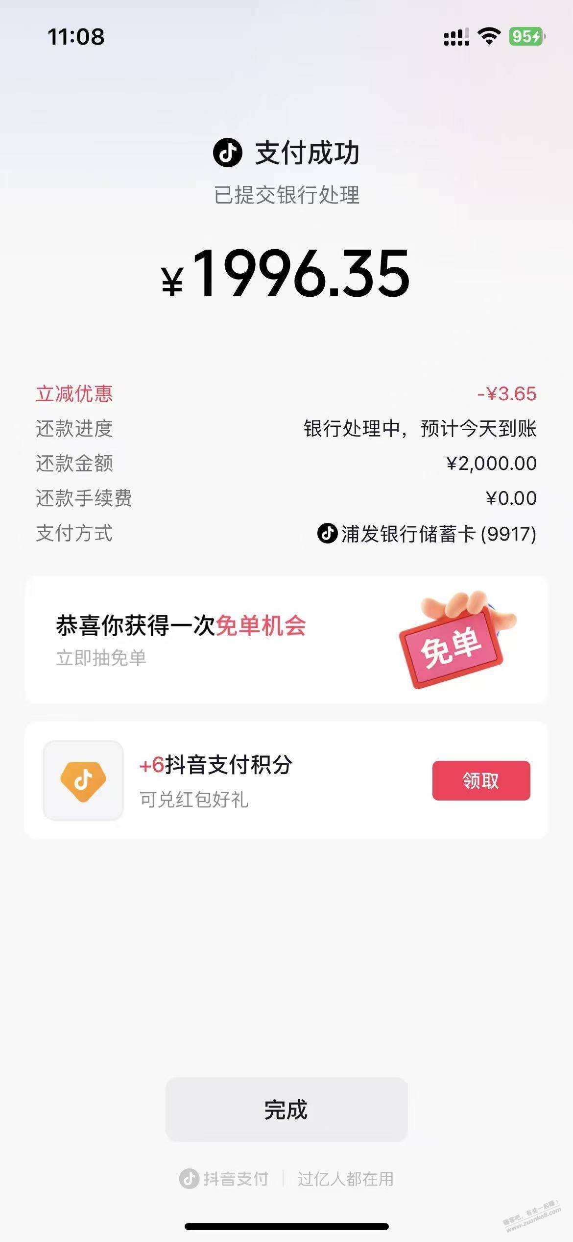 抖音还款,浦发减了3.65元小水