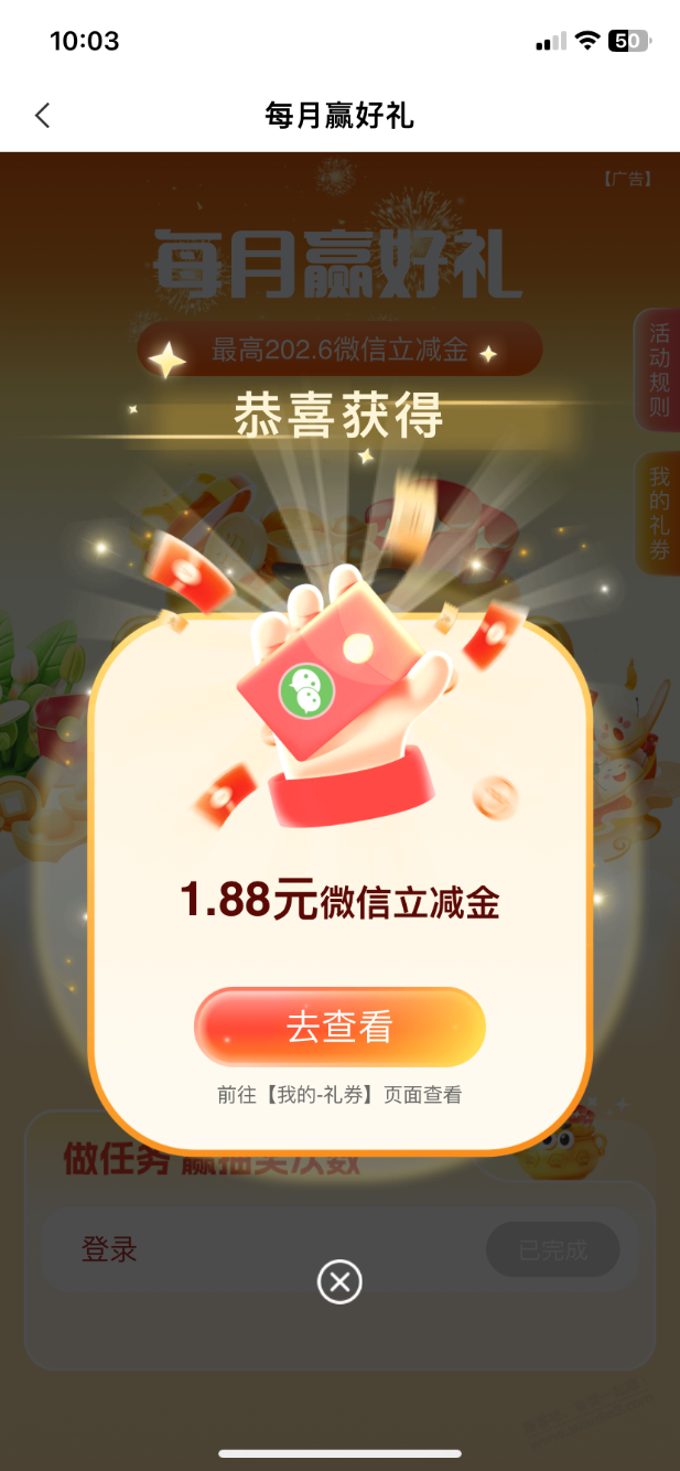 体验赢好礼进入,下面有个,每月赢好礼可以抽