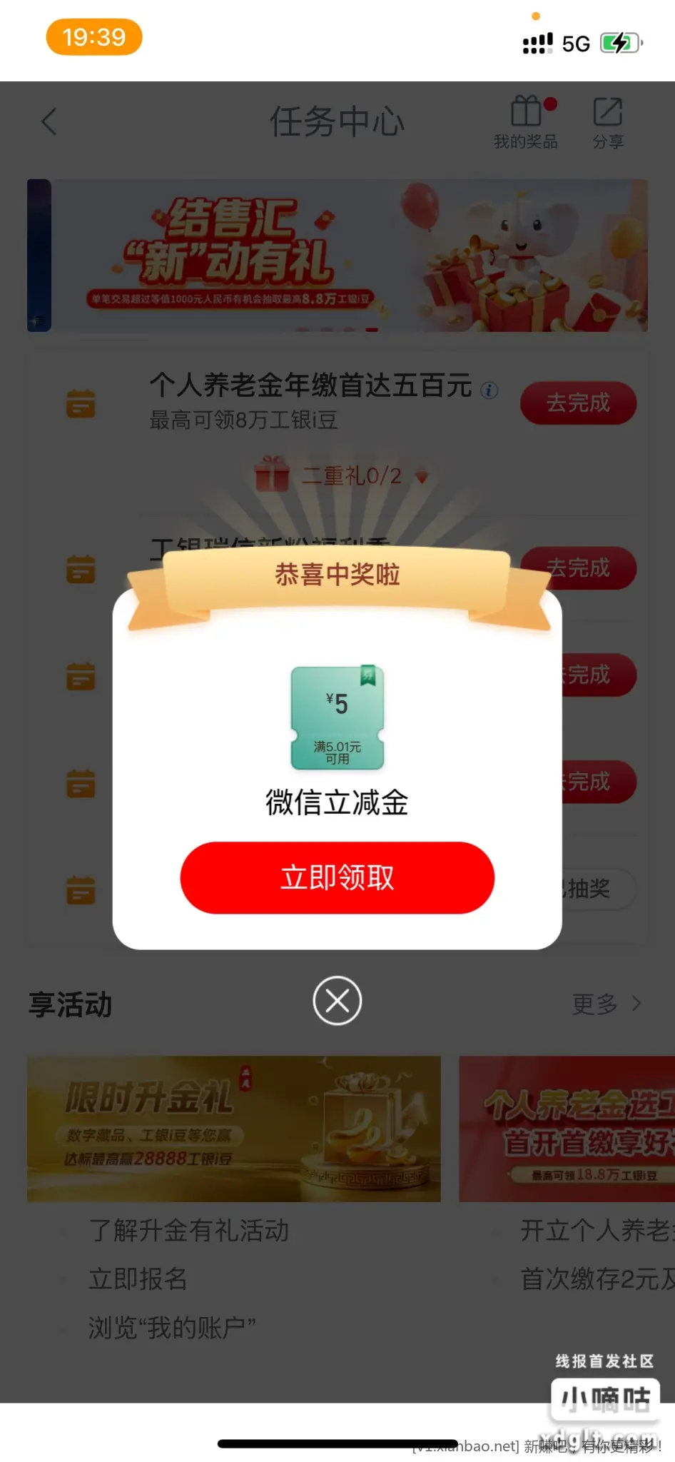 工商银行app,任务中心,兴农同享礼第一期,进去点最上面分享按钮一下返回抽奖,五元立减金