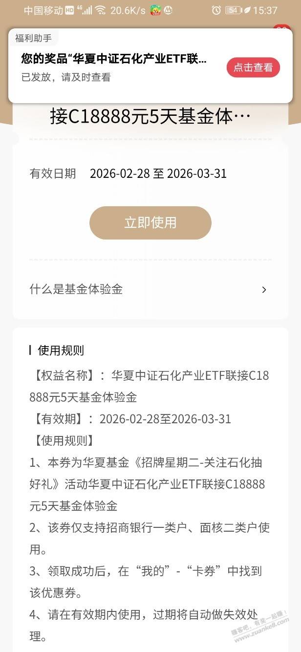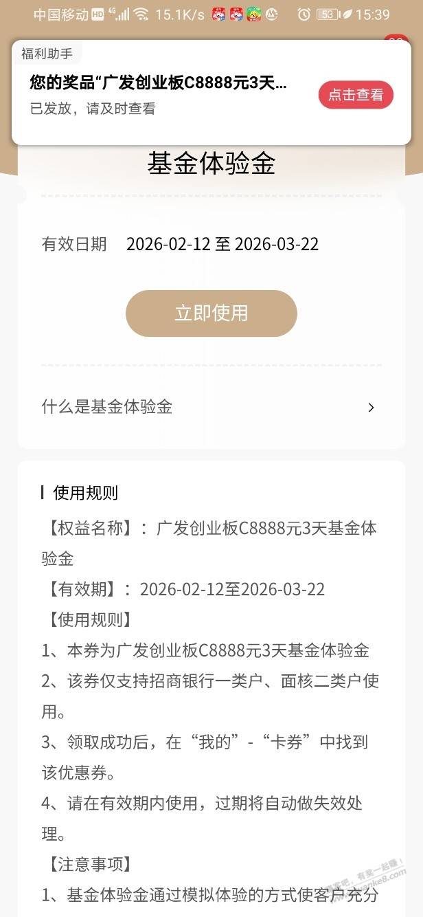 【招商银行】基金体验金18888元,黑号有~