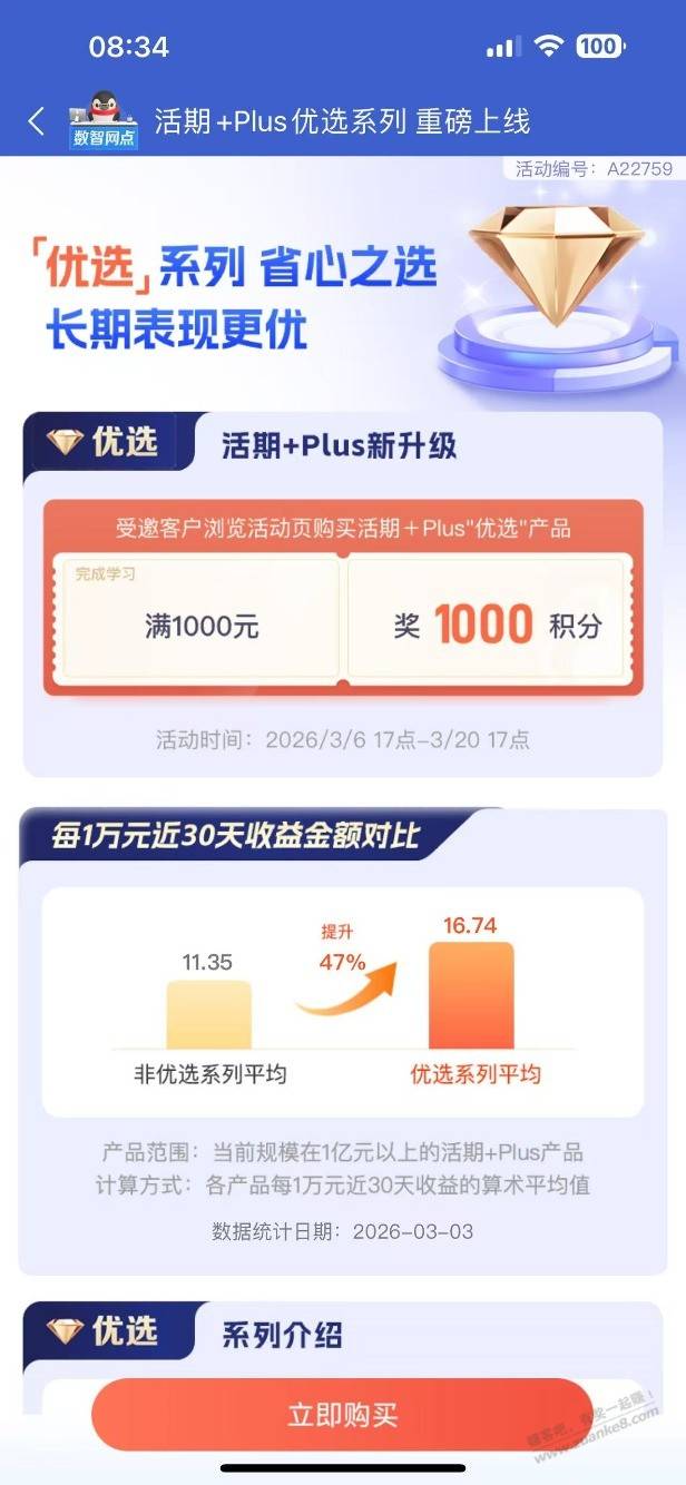 微众银行打开自动弹购买1000活期+送1000积分(价值10元)