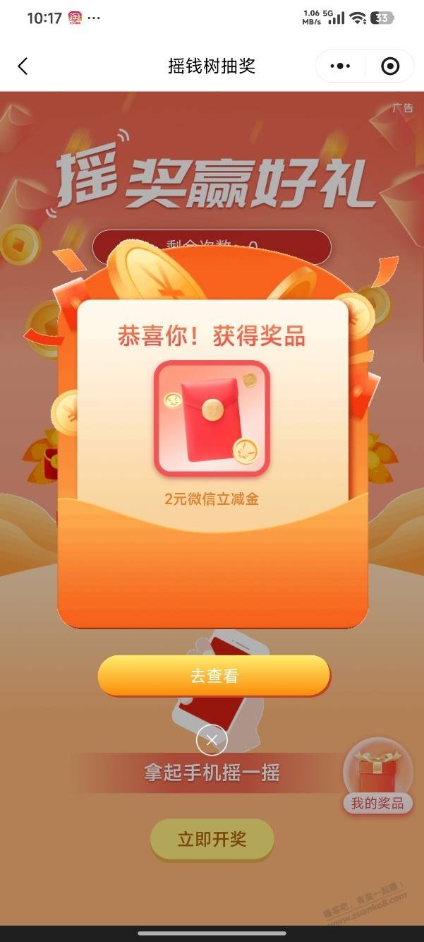工商银行app,任务中心,兴农同享礼第一期,进去点最上面分享按钮一下返回抽奖,五元立减金