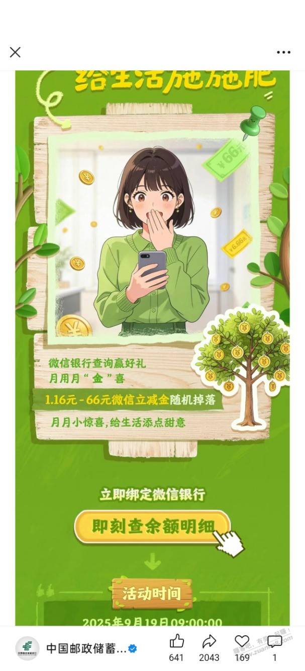 邮储浏览活动,15日0点抽1.6到66元微信立减金