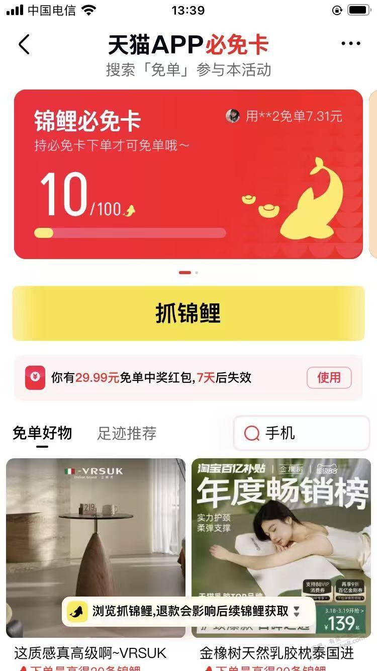 天猫app,一个锦鲤免单,一个超神卡免单,几个号都有,大的29.9,小的几块,