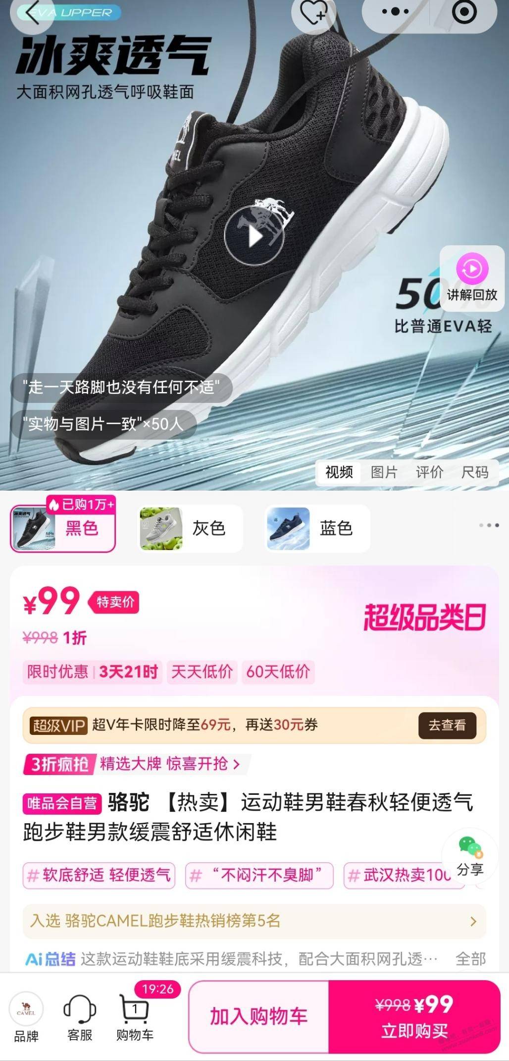 1折99r,3个颜色还有好多尺码。给老丈人薅了2双,希望他步步顺心,顺便以后别老挑我毛病!