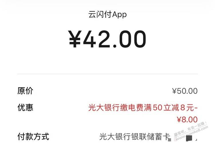 速度!云闪付生活缴费光大借记卡50-8