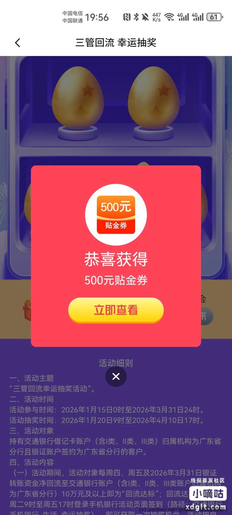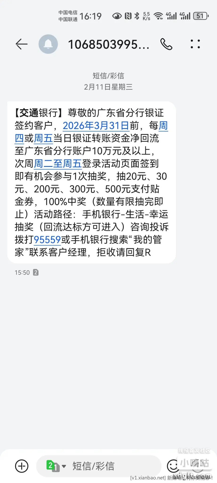 看广东中行小助手的微信消息,回馈好礼可以抽