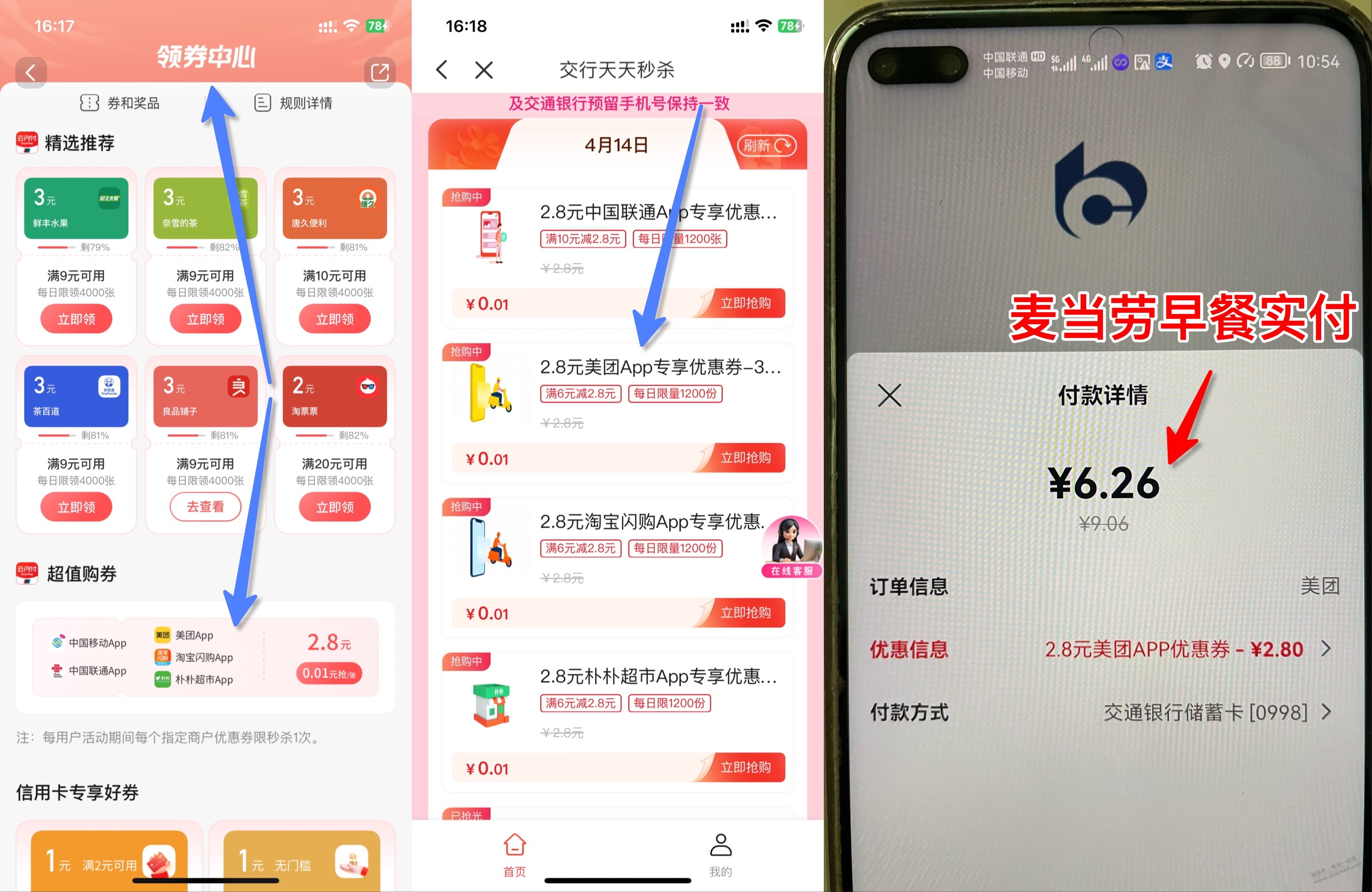 明天早上,再去美团app…特价团,找到这款新品麦当劳早餐,下单 付款选云闪付…再跳到交通银行app,选交通卡就可以再减2.8,最后实付6.26元