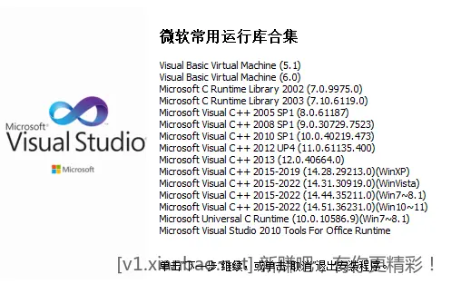 Microsoft Visual C++ Redistributable(简称MSVC,VB/VC,VC运行库)系统运行库是Windows操作系统应用程序的基础类型库的可再发行程序包.Microsoft Visual C++运行库是系统装机必备组件,此版VC++运行库合集(微软常用运行库合集),整合了所有版本Visual C ++,可以自选更新VC++版本组件,并提供图形安装界面。