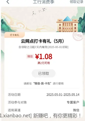 江苏工行云网点打卡1.08立减金