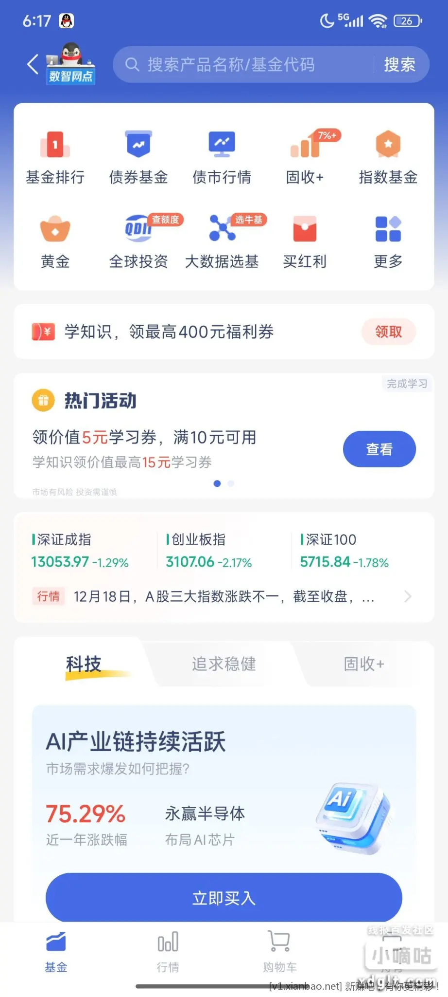 微众app-基金-中间滚动广告学知识,领3个5基金券,满10元使用。人人15