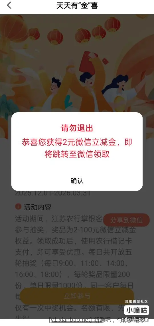 农行江苏地区,城市专区,天天金喜,2元微信立减金