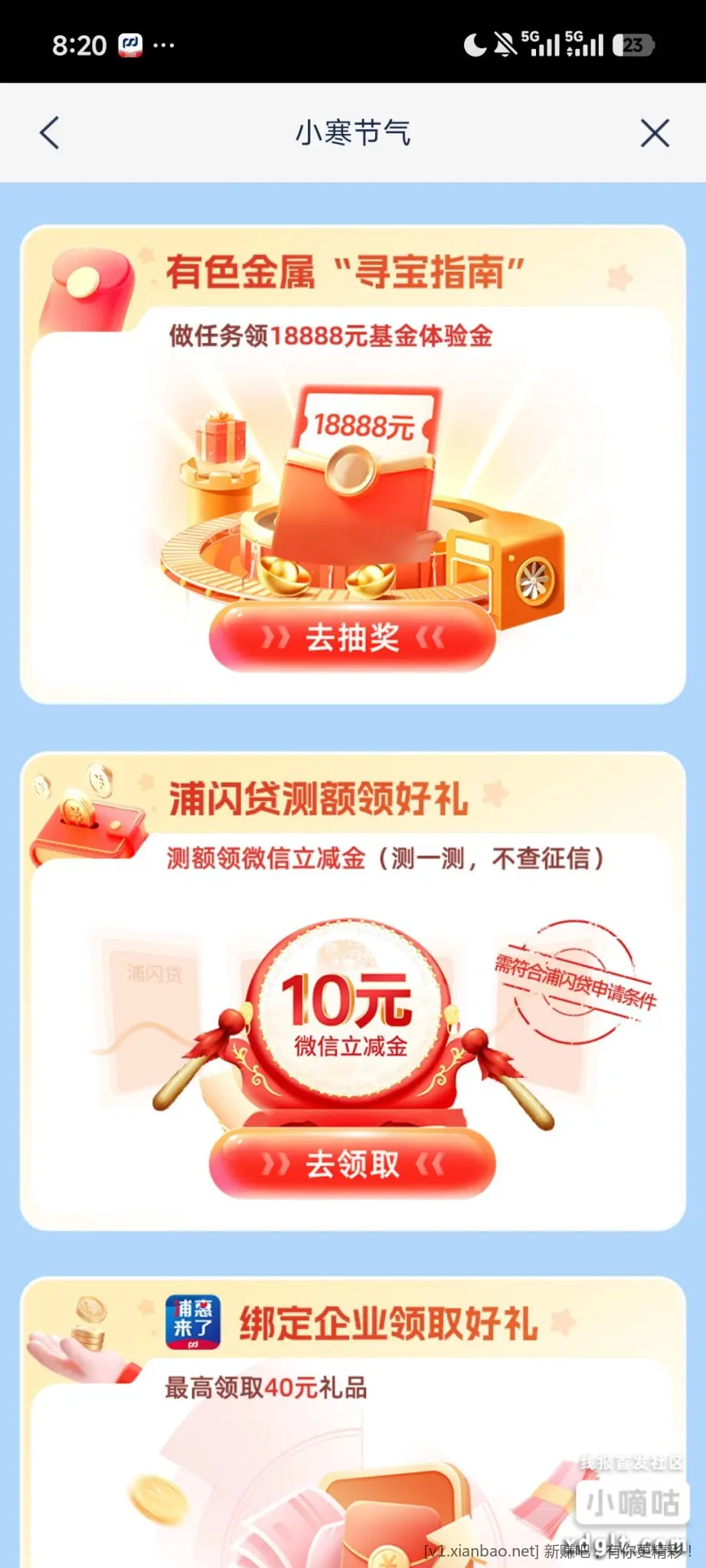浦发银行,首页横幅内,多个活动,18888体验金,测额,10立减金,有企业还可以得40立减金