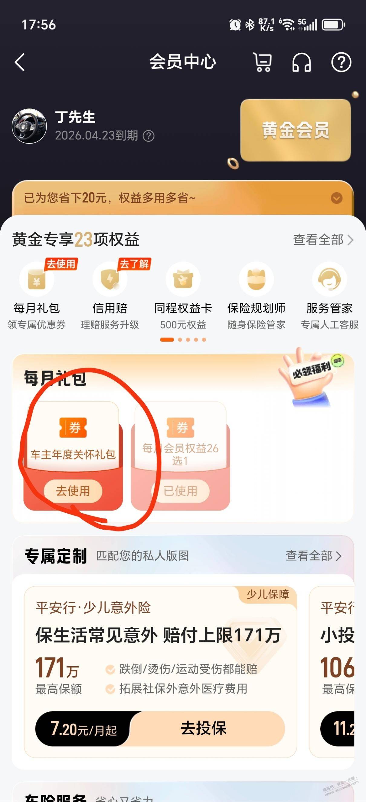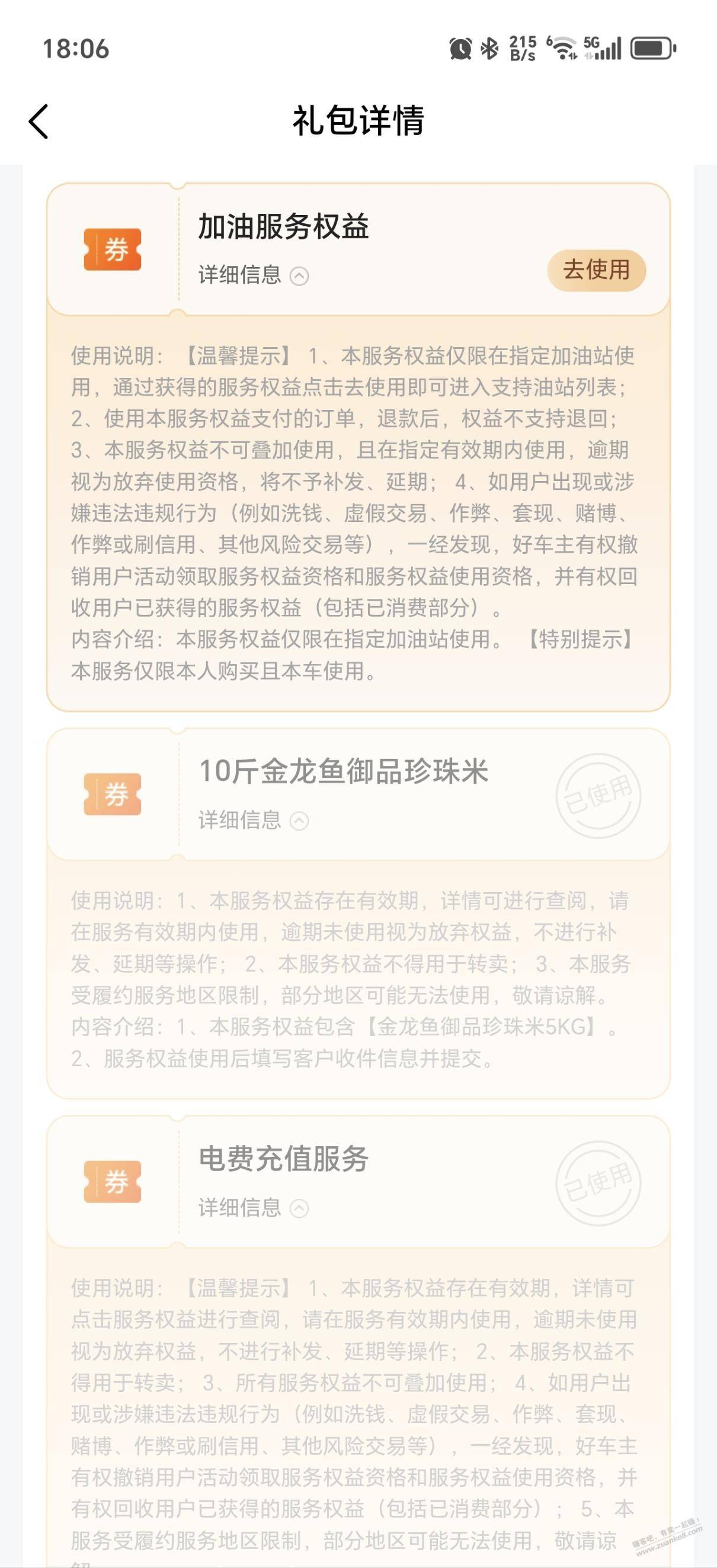 预约保险送8选2,里面最值得是加油200-100,以及电费100-50,以及年底保险快到期的有年终关怀兑换三次,我选的是电费51-50,金龙鱼御品珍珠米5kg(京东那边是59包邮),油200-50,觉得有用的加果。