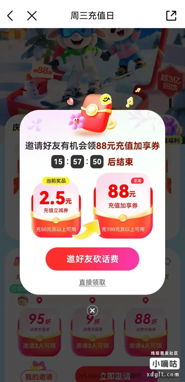 周三8/12/18点移动αpp,嗖【星期充值日】抽88折话费奍