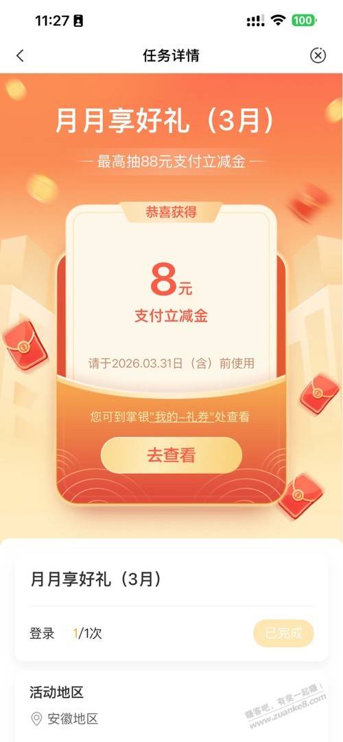 农行 app-热门活动-体验赢好礼 -更多 -下拉底部月月享好礼 中了 8 立减金