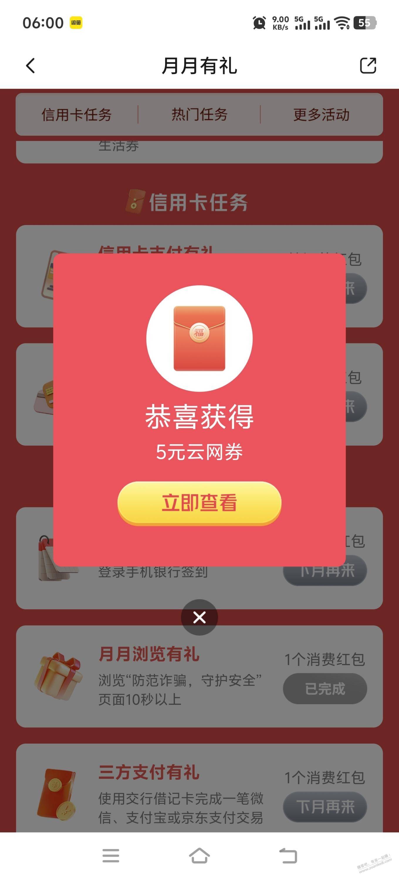 交行月月有礼,增加了一个浏览任务目前放水了5元云网券